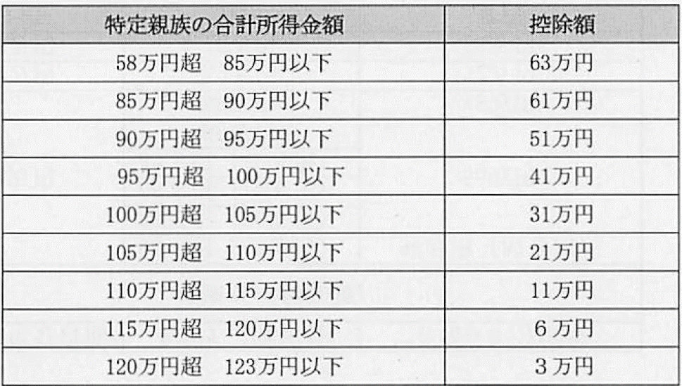 令和7年分以後の所得税について、特定親族特別控除の対象となる特定親族に該当する場合には、その合計所得金額に応じて下表の控除額が控除される(所法84の2)。