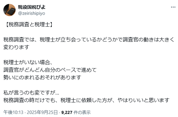 現役の国税職員と思われるアカウントが、以下のようなポストをしています。